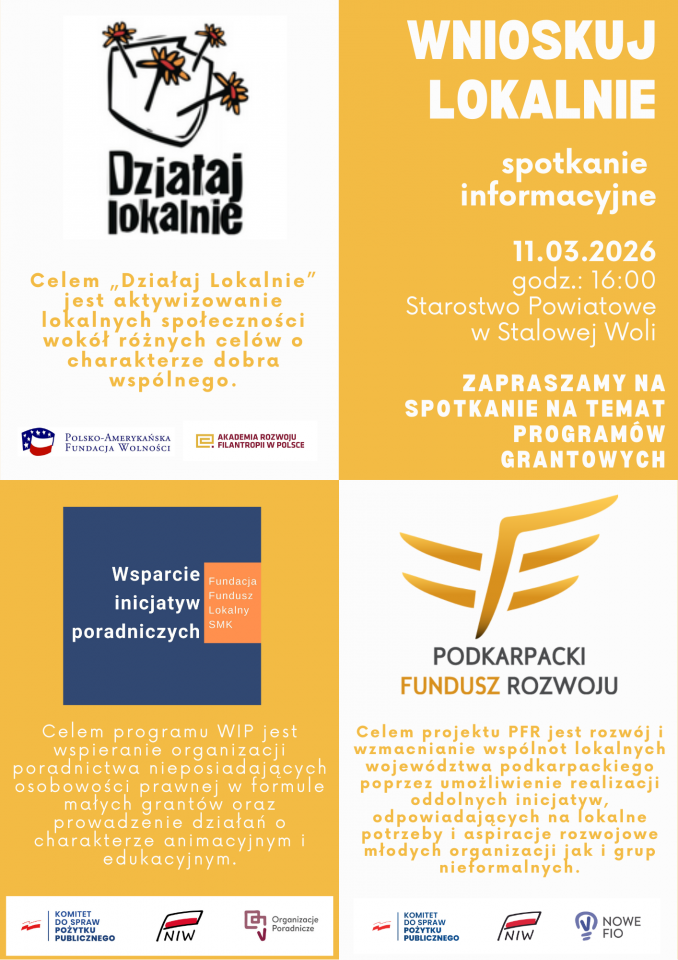 Fundacja Fundusz Lokalny SMK realizuje projekty grantowe, dzięki którym lokalne organizacje mogą skorzystać ze środków na realizację swoich pomysłów. Spotkanie informacyjne dot. projektów odbędzie się 11 marca o godz. 16.00 w Starostwie Powiatowym w Stalowej Woli (sala 113).