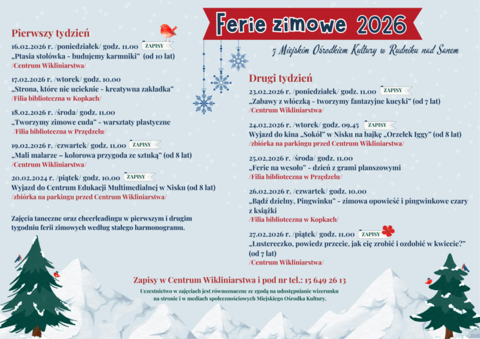 Miejski Ośrodek Kultury w Rudniku nad Sanem zaprasza dzieci i młodzież na Ferie Zimowe 2026, które upłyną pod znakiem twórczych warsztatów, wyjazdów, zabawy i spotkań z kulturą. Bogaty program przygotowany na dwa tygodnie ferii sprawi, że każdy młody uczestnik znajdzie coś dla siebie – od zajęć plastycznych i rękodzielniczych, przez literackie opowieści, aż po wspólne wyjazdy i gry planszowe.