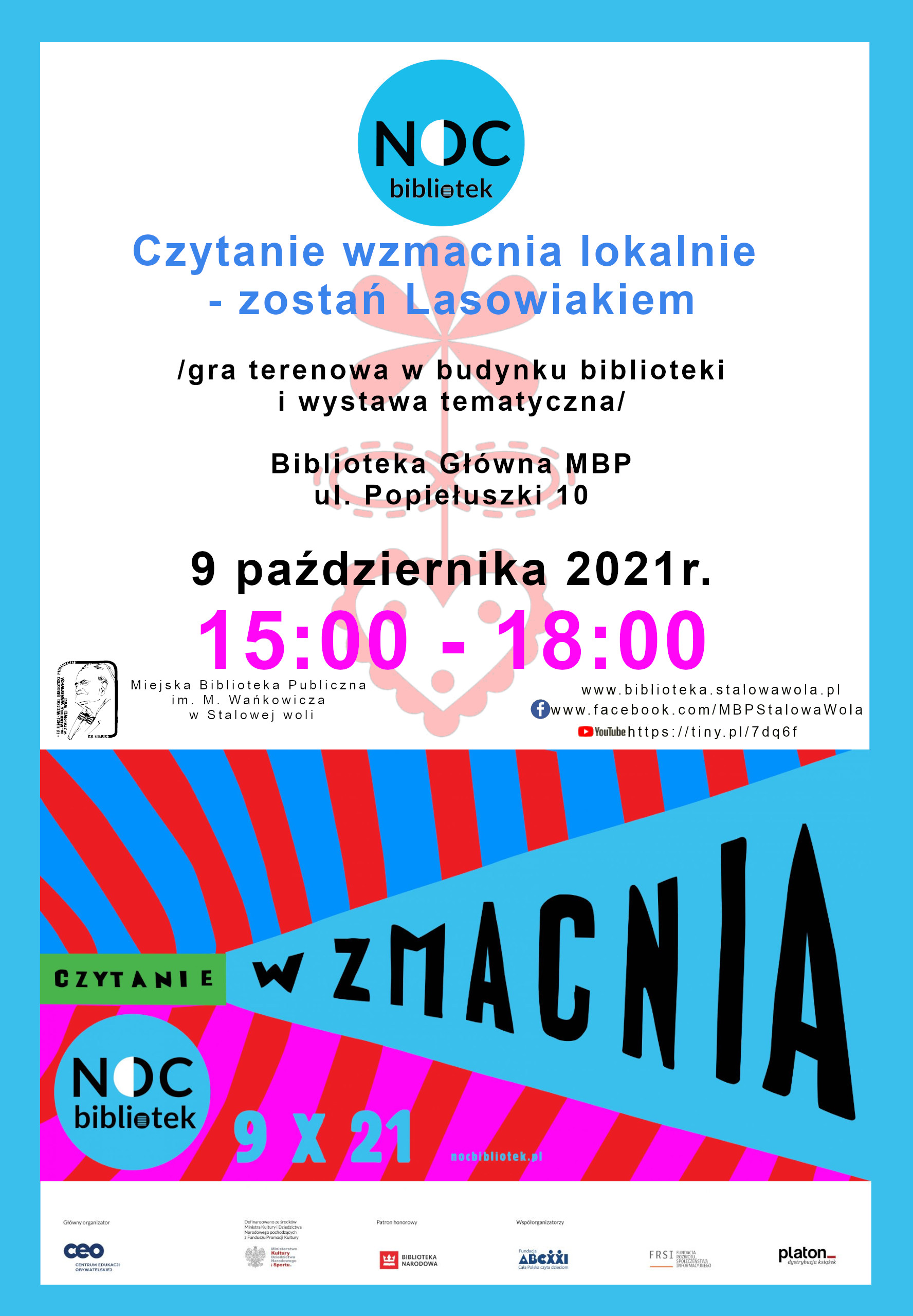 Po raz kolejny w Stalowej Woli będziemy świętować Ogólnopolską Noc Bibliotek, która odbędzie się 9 października, w godz. 15-18. – Zapraszamy wszystkich chętnych na grą terenową i wystawę tematyczną „Czytanie wzmacnia lokalnie – zostań Lasowiakiem” w budynku Biblioteki Głównej, przy ul. Popiełuszki 10 – zachęcają pracownicy Miejskiej Biblioteki Publicznej w Stalowej Woli.