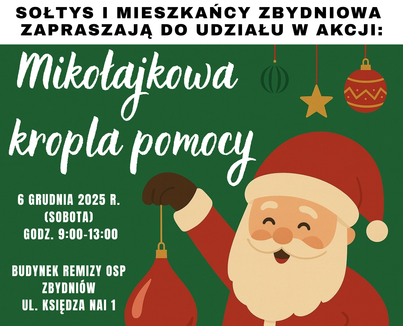 Już w sobotę, 6 grudnia 2025 roku, w Zbydniowie odbędzie się wyjątkowa, świąteczna akcja charytatywna „Mikołajkowa Kropla Pomocy”. Wydarzenie zaplanowano w godzinach 9:00–13:00 w budynku remizy OSP Zbydniów przy ul. Księdza Nai 1.