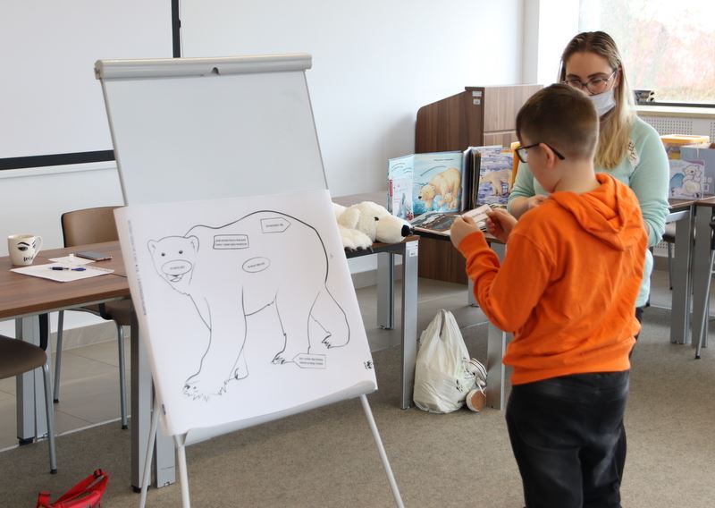 Zakończyliśmy I turnus ferii zimowych w bibliotece. Głównym bohaterem czwartkowych zajęć był biały miś polarny. Przygotowana została duża plansza z wizerunkiem niedźwiedzia polarnego, a zadaniem dzieci było przyklejanie w odpowiednie miejsca karteczek z wypisanymi charakterystycznymi cechami tego zwierzęcia. Taka forma zabawy pozwala na lepsze zapamiętanie poznanych informacji na dany temat.