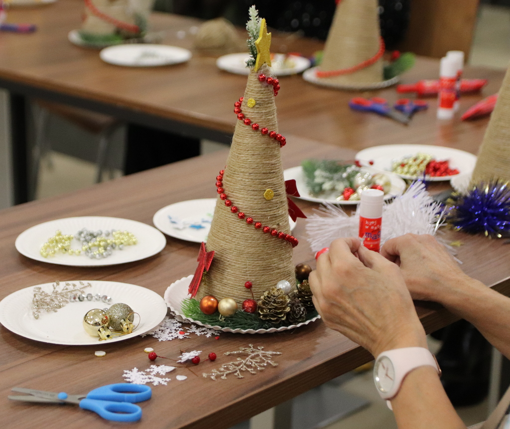 Pod czujnym okiem bibliotekarek uczestnicy wspólnie tworzyli efektowne minichoinki. Do ich wykonania wykorzystano tekturowe stożki oplatane jutowym sznurkiem, które następnie przyozdabiano bombkami, śnieżkami i gwiazdkami. Nie zabrakło również naturalnych dodatków – gałązek, szyszek oraz kolorowych sznurków. Całość uzupełniały brokatowe akcenty, wstążki i drobne dekoracje, dzięki którym każda choinka zyskała indywidualny charakter i wyjątkowy, świąteczny blask.