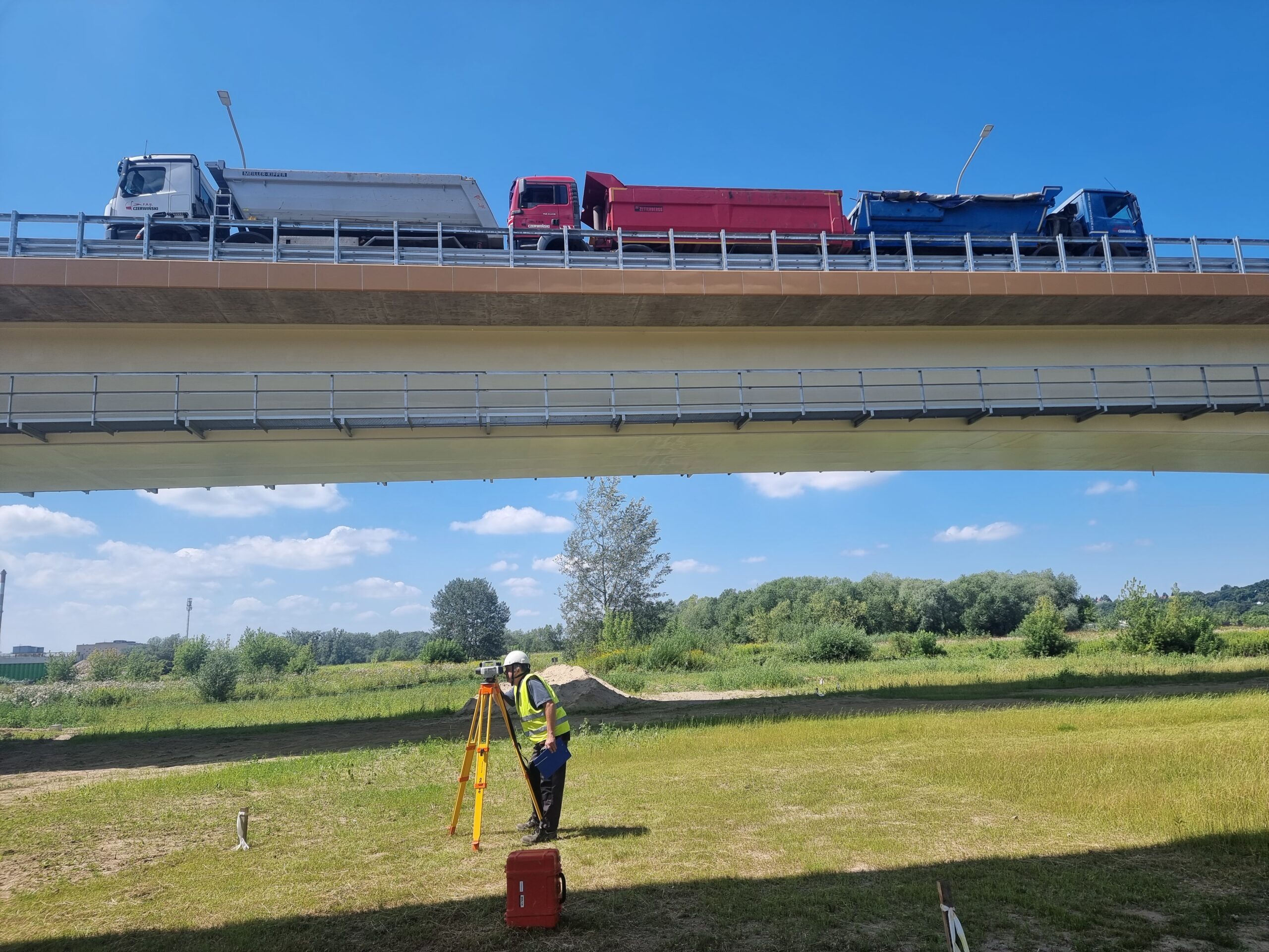 Następnie przeprowadzono próbę dynamiczną, w której ciężarówki przejeżdżały przez most, co pozwoliło określić częstotliwości drgań, współczynnik tłumienia i właściwości dynamiczne przęseł.