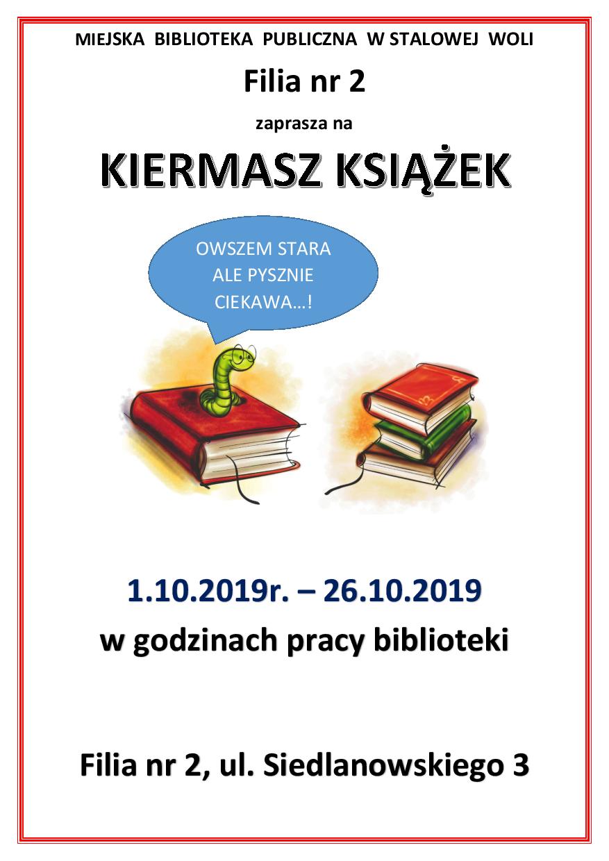 Wszystkim miłośnikom książek przypominamy, że w ramach Stalowowolskich Dni Książki, które przed nami, już 1 października rusza książkowy kiermasz. Na zakupy ciekawych książek po symbolicznych cenach zapraszamy do naszej Filii nr 2 przy ul. Marcelego Siedlanowskiego 3. Kiermasz będzie czynny do 26 października – zawsze w godzinach otwarcia biblioteki.