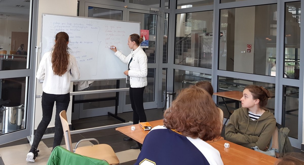 Rzucając kostką uczestnik zabawy wylosowywał obrazek. Do niego wymyślał wersy, metafory, porównania. Później zostały one wykorzystane do tworzenia wspólnego utworu. Tak powstał wiersz „Liczydło i maska”. Składał się on z dwóch części. W pierwszej podmiot liryczny był osobą starszą, w drugiej dopiero wchodził w dorosłość. Tradycyjnie w ramach zajęć odbył się Turniej Jednego Utworu. Zwyciężył wiersz „Busola czasu” Katarzyny Janochy.