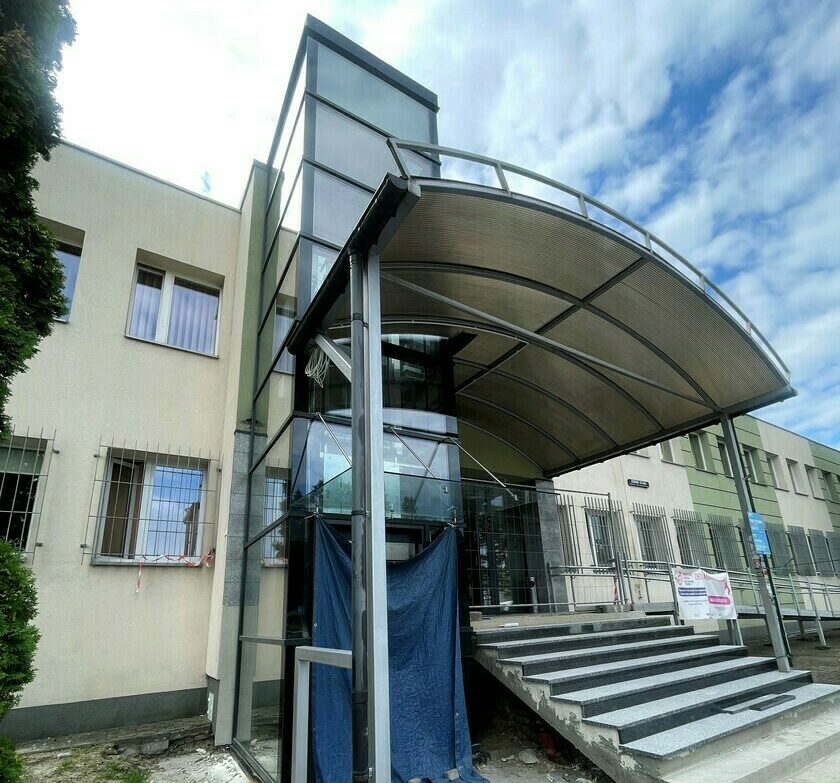 Nowa winda, umiejscowiona przy głównym wejściu do przychodni przy ul. Kwiatkowskiego, została już zamontowana i czeka na uruchomienie po zakończeniu pozostałych prac. To rozwiązanie, które znacząco poprawi komfort poruszania się po budynku – zwłaszcza dla osób starszych, z niepełnosprawnościami oraz rodziców z małymi dziećmi. Z poziomu chodnika będzie można łatwo dotrzeć na wyższą kondygnację bez pokonywania schodów.