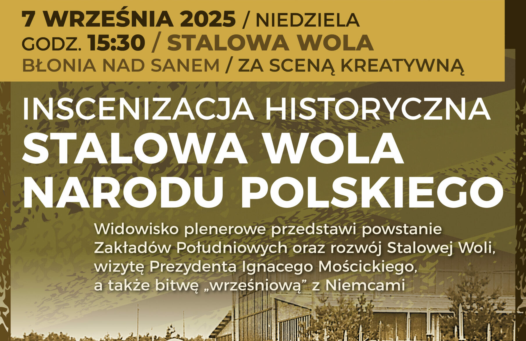 Całość poprowadzi niepowtarzalny narrator – prof. Andrzej Olejko, a inscenizacja zakończy się symbolicznym przypomnieniem, że odwaga i ofiarność przodków były fundamentem, na którym zbudowano nowoczesną Stalową Wolę. To będzie nie tylko widowisko, ale także żywa lekcja historii. Chcemy, aby mieszkańcy i goście poczuli dumę z dziedzictwa naszego miasta i zrozumieli, jak wielką rolę odegrała Stalowa Wola w historii Polski. Udział w inscenizacji będzie niepowtarzalną okazją, by przenieść się w czasie i na własne oczy zobaczyć, jak rodziła się „Stalowa Wola Narodu Polskiego”.