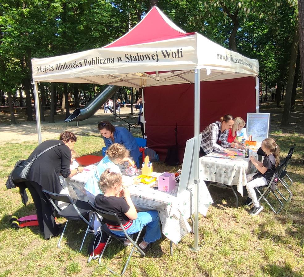 Pieski, kotki, sowy, rybki a nawet… marchewka. O takich kształtach powstawały kolorowe zakładki na stoisku Miejskiej Biblioteki Publicznej podczas Miejskiego Dnia Dziecka. Dzieciaki mogły te zakładki zrobić samodzielnie korzystając z kartek, oczek, ozdób i różnych przyborów plastycznych, jakie oddaliśmy do ich dyspozycji. Gdy ktoś miał trudności, pomagali rodzice i my – bibliotekarze. Nie brakowało też chętnych na wykonanie Biblioniezapominajki – specjalnego magnesu z kartkami na lodówkę.