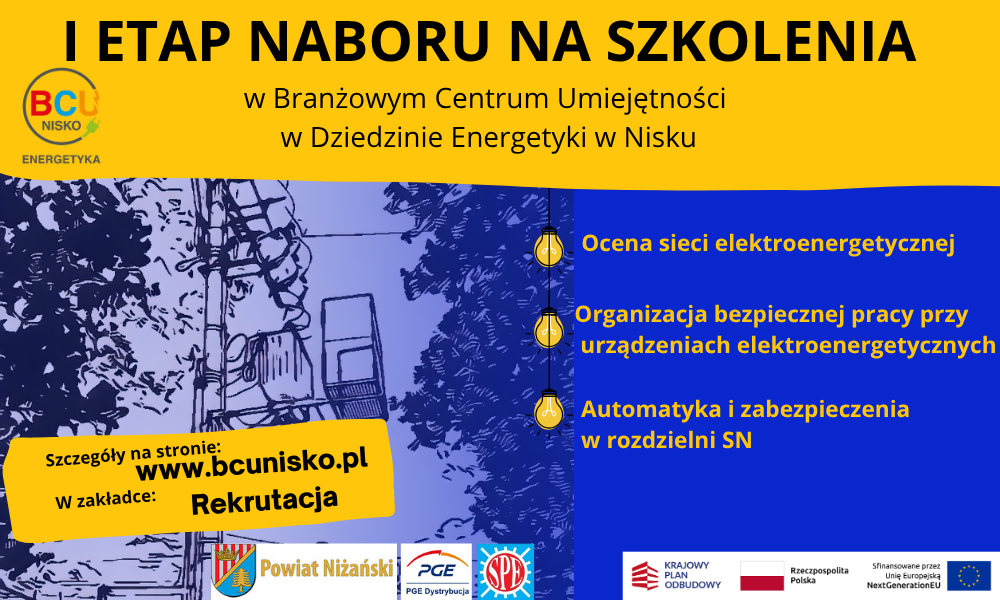 Powiat Niżański informuje, że Branżowe Centrum Umiejętności w Dziedzinie Energetyki w Nisku (BCU) rozpoczęło nabór uczestników na pierwsze trzy szkolenia z zakresu energetyki. To wyjątkowa okazja zarówno dla mieszkańców powiatu i okolic, jak i mieszkańców całej Polski – zarówno dla osób młodych (w wieku 14-24 lata), jak i osób dorosłych – by zdobyć praktyczne umiejętności i wiedzę, które pozwolą na rozwój zawodowy w dynamicznie rozwijającej się branży elektroenergetycznej.