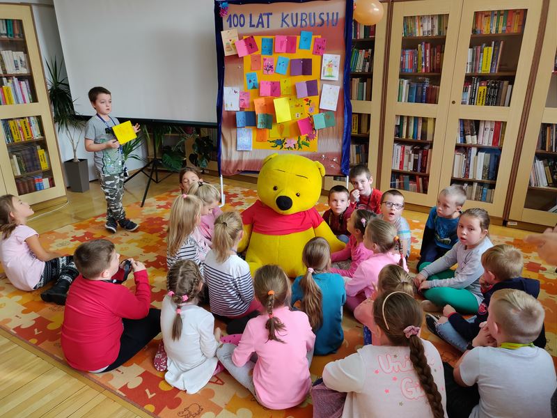 14 października jak co roku obchodzimy urodziny Kubusia Puchatka. W tym roku nasz solenizant kończył 93 lata. Jako goście przybyły dzieci z dwóch klas pierwszych z PSP nr 1. Impreza rozpoczęła się od prezentacji na temat autora AA.Milne i historii powstania książki o Kubusiu Puchatku. Następnie jak to na urodzinach bywa goście wesoło bawili się podczas zgaduj-zgaduli rozwiązywania rebusów i quizów. Nie zabrakło także pięknych laurek dla solenizanta.