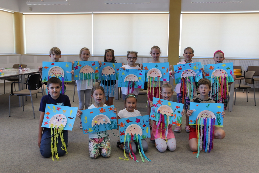Na zajęciach wakacyjnych w dniu 11 sierpnia zabraliśmy dzieci w podróż do świata morskich głębin. Uczestnicy dowiedzieli się, jakie zwierzęta żyją na dnie oceanów, co to są rafy koralowe i po co meduzom parzydełka. Odgadywaliśmy morskie zagadki i czytaliśmy książkę Liliany Bardijewskiej „O czym szumią muszle?”.