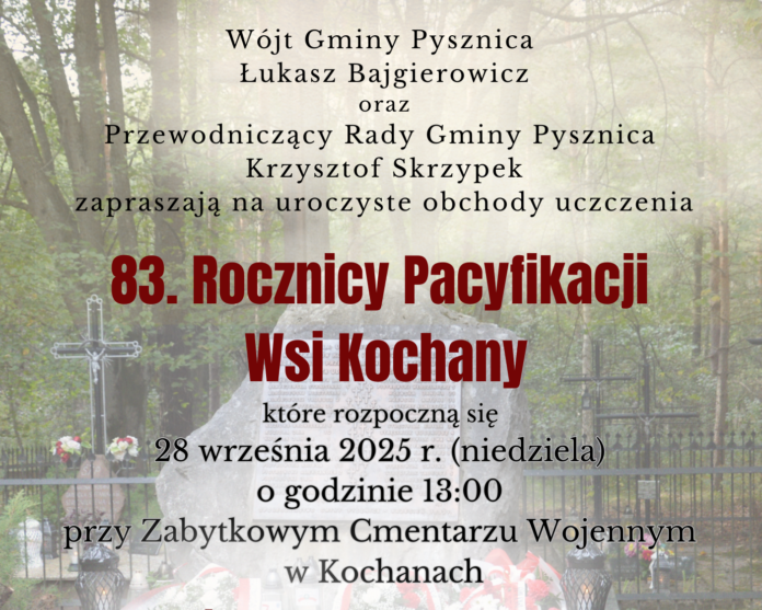 Wójt Gminy Pysznica Łukasz Bajgierowicz oraz Przewodniczący Rady Gminy Pysznica Krzysztof Skrzypek zapraszają mieszkańców i gości na uroczyste obchody 83. rocznicy pacyfikacji wsi Kochany, które odbędą się w najbliższą niedzielę, 28 września, o godzinie 13:00.