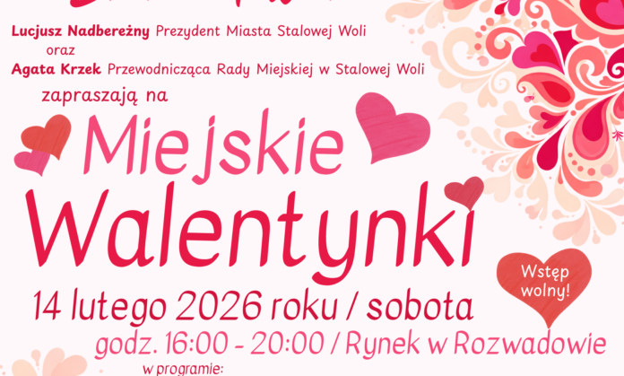 Już w sobotę, 14 lutego 2026 roku, serce Stalowej Woli zabije mocniej. Na wyjątkowe, pełne ciepła i romantycznej atmosfery Miejskie Walentynki zapraszają Lucjusz Nadbereżny Prezydent Miasta Stalowej Woli oraz Agata Krzek Przewodnicząca Rady Miejskiej w Stalowej Woli. Wydarzenie odbędzie się w niezwykle klimatycznym miejscu – na Rynku w Rozwadowie, w godzinach 16:00–20:00.